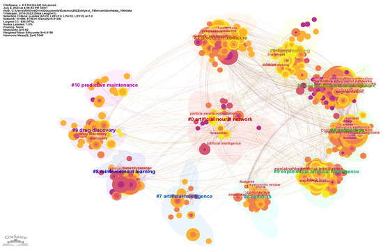 The most cited papers throughout the clusters are [3] (cluster #0) related to artificial intelligence solutions for thyroid pathologies ref. [4] (clusters #1, #3, #4, #5) is related to supporting model decisions in a context that a human can readily interpret (explainable AI), ref. [5] (cluster #2) and [6] (cluster #6) are on an AI/ML technique for COVID-19 outbreaks, ref. [7] (cluster #7) is devoted to AI and DL technology, facilitating data analytics for IoT systems, ref. [8] (cluster #8) is on reinforcement learning applications in different fields, ref. [9] (cluster #9) is about AI applications in drug discovery, ref. [10] (cluster #10) is on AI-based network communication, and ref. [11] (cluster #11) is on AI for environmental studies.
