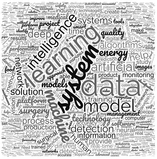 The list of the obtained keywords includes “artificial neural network”, “artificial intelligence”, “deep learning”, “lung cancer”, “explainable artificial intelligence”, “COVID-19 patient”, “IoT device”, “reinforcement learning”, “drug discovery”, “wireless communication”, and “aqueous solution”, which are associated with the most significant AI models, as well as applications.