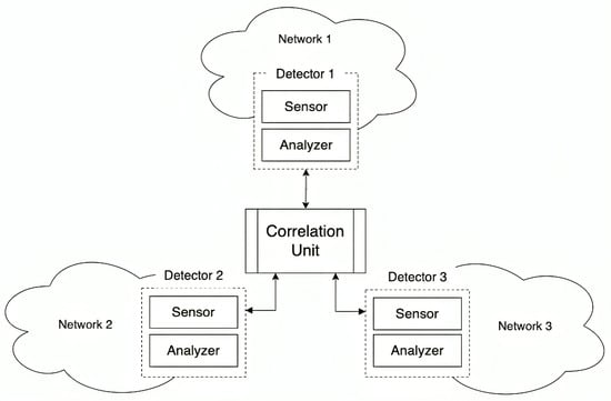 A traditional CIDS has two primary functional units that work together to provide a high-level overview of network security. The first unit is the detection unit (consisting of a sensor and analyzer), which is responsible for monitoring subnetworks. The sensor is responsible for collecting data from the network, while the analyzer analyzes the traffic from the sensor and generates alerts. These detectors generate low-level intrusion alerts, which are then passed on to the second unit. The second unit is the data correlation unit, which takes these alerts from individual detectors and correlates them to provide a comprehensive overview of the security state of the entire network. The traditional CIDS system is shown in Figure 1 [18].
