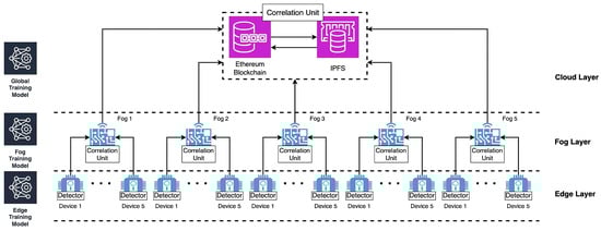 This research also used edge–fog–cloud architecture for a hierarchical CIDS based on DLT. The architecture is a multitiered infrastructure that leverages the combined strengths of edge, fog, and cloud computing to enhance the security and efficiency of intrusion detection [24,25]. In this architecture, detector units in edge devices capture the network traffic through sensor units. After that, the detector unit analyzes the captured traffic locally through the analyzer unit. Fog computing layers, situated closer to the core network, further refine and aggregate the model from edge devices to build the fog layer training model. The fog computing layer averages the weight from each device training model and another for devices. Finally, the cloud provides aggregate data from fog devices to build the global training model. The cloud layer also provides the integration of DLT for secure model sharing and transaction recording, ensuring data integrity and trustworthiness. The global training model is sent back to the fog layer and edge layer to update the local model in each layer.