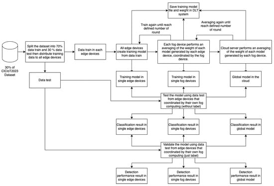 This research used FL with hierarchical updates in the edge–fog–cloud architecture. Further details of the proposed model can be seen in Figure 3. The image depicts a detailed flowchart outlining a process for managing a dataset within the realm of hierarchical updates in the FL concept. It showcases the progression from splitting the dataset into training and detection subsets to the final detection result. The dataset is initially divided into a 70% training set and a 30% detection dataset. The process begins with the initialization of a global model on the cloud server, and edge devices and fog nodes are selected to participate. Each round of FL involves selecting edge devices, distributing the global model to them, allowing local training without sharing data, aggregating updated models at the fog node, and sending the consolidated model back to the cloud server. This round-based communication is repeated for multiple rounds to iteratively enhance the global model by incorporating local knowledge from edge devices. Through this iterative process, the global model converges to reflect the collective intelligence of all participating edge devices.