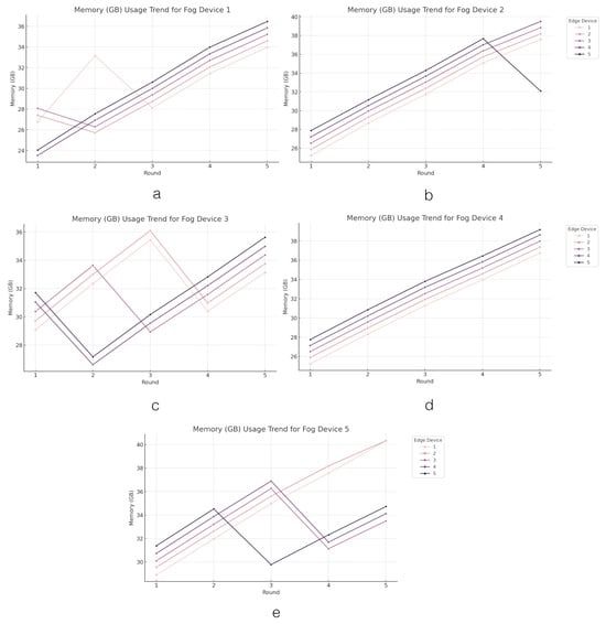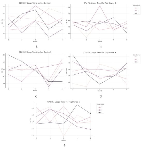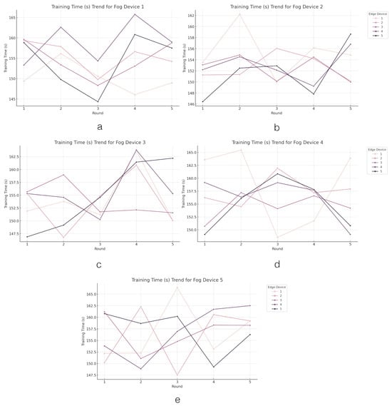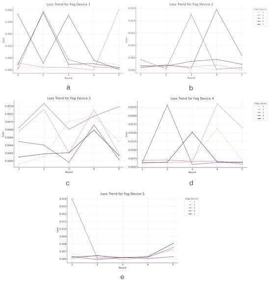 The loss value trend across the edge layer. Figures (a–e) present the trend of loss values in edge devices grouped by fog devices.