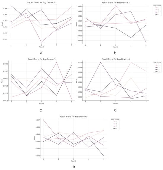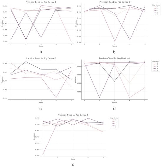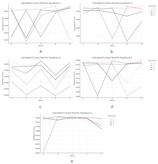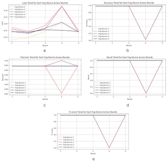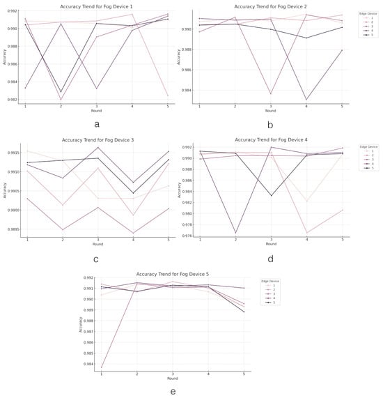 Now, we analyze the results from FL within the edge–fog–cloud architecture. In this analysis, each graph illustrates the progression of devices over multiple rounds (on the x axis), during which they compute the loss function value (on the y axis) associated with their segment of the model training. The initial analysis focuses on assessing the performance of the loss parameter. The performance outcomes of the loss parameter at the edge layer are depicted in Figure 4. The graph comprises five line graphs labeled from A to E, each representing the ‘loss trend’ for a different ‘fog device’ (from Device 1 to Device 5) across several rounds of an FL process within an edge–fog–cloud architecture. Each ‘fog device’ oversees five ‘edge devices’ involved in the learning process, with the colors in the curves corresponding to different edge devices contributing to the learning process.