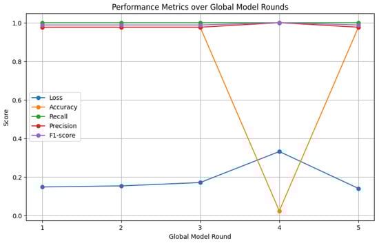 The accuracy, precision, recall, and F1-score parameters measured in percentages reflect high-performance levels in centralized learning. Specifically, accuracy, precision, recall, and F1-score values reach 99.36%, 99.55%, 99.79%, and 99.67%, respectively. In contrast, the parameters obtained from FL, utilizing an edge–fog–cloud architecture after five rounds of training, exhibit slightly lower performance levels compared to centralized learning. These include accuracy, precision, recall, and F1-score values at 97.65%, 97.65%, 100%, and 98.81%, respectively.