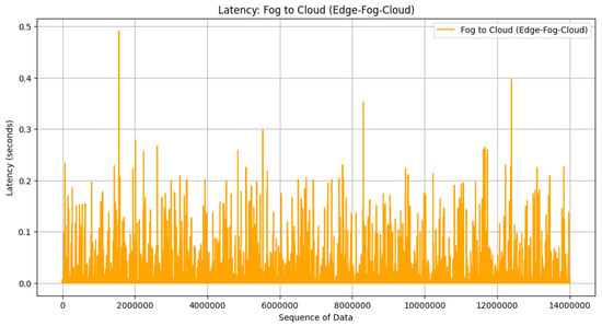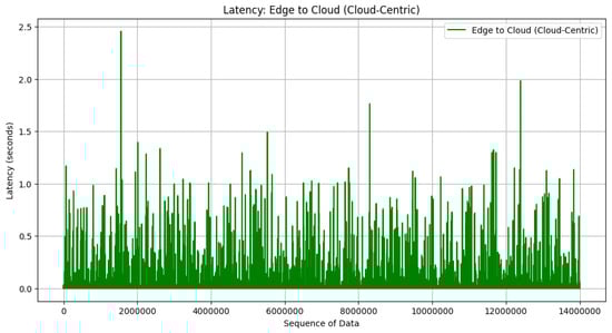 The result from the cloud-centric architecture in Figure 17 has bigger latency than edge to fog in Figure 15 and fog to cloud in Figure 16. The latency can be reduced by more than 50% when the fog–edge–cloud architecture is employed in the CIDS architecture. In edge–fog–cloud architecture, model updates are processed and aggregated locally at fog devices before being sent to the cloud server. Latency reduction is achieved by minimizing the distance data need to travel for processing and aggregation. Local aggregation at fog devices can reduce the latency associated with transmitting data to a centralized cloud server. In cloud-centric architecture, all model updates are sent directly to the centralized cloud server for aggregation. Latency is determined by the network speed between edge devices and the cloud server, as well as the processing time for model aggregation at the cloud server. Latency can be higher in cloud-centric architecture compared to edge–fog–cloud architecture due to the longer distance data need to travel to reach the cloud server and the potential network congestion.