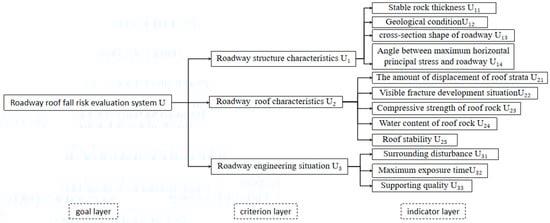 Roof collapses in coal mining are caused by the interaction of many factors. This paper performs an analysis of the main factors. Based on the investigation of a large number of risk factors of roadway roof falls, the relevant factors affecting the risk assessment of roadway roof falls were extracted. A risk evaluation system U of roadway roof falls is established. An analysis method is used to divide the factors of roadway caving risk assessments according to the nature of the influencing factors and the engineering characteristics. Among them, the criterion layer includes the roadway structure characteristics U1, roadway roof characteristics U2, and roadway engineering conditions U3, and the indicator layer includes 12 indicators. See Figure 1 for details. The overview of the indicators is shown in Table 1.