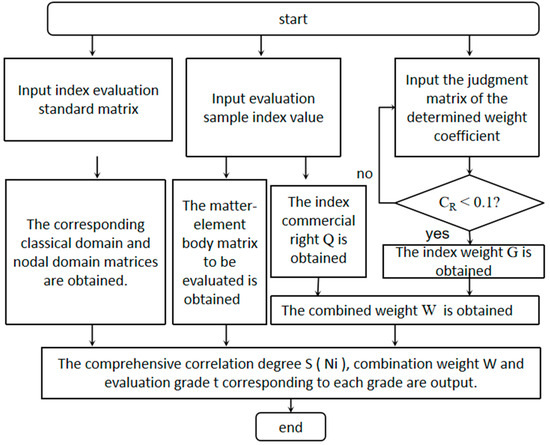 In the formula, R0t is the classical domain matter element; N is the whole matter element to be evaluated; Cj (j = 1, 2, …, n) is the evaluation index of the thing N; V0tj = <a0tj, b0tj> is the evaluation index Cj of the classical domain matter element in t (t = 1, 2, …, g); the value range of the evaluation grade is the classical domain; a0tj is the lower limit of the classical domain; b0tj is the upper limit of the classical domain.
