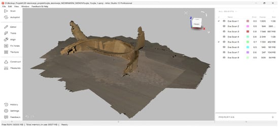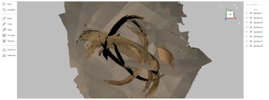The first step in raw data processing is visually analyzing the captured scans and selecting only the scans needed to construct the 3D model. It is always the best solution to build the digital 3D model from the smallest possible number of scans, which reduces time and computational demands. To achieve an accurate 3D model, the team merged scans Nos. 1 and 5 (Figure 3). In the next step, selected scans need to be processed. Processing means that the base needs to be deleted, noise needs to be filtered, selected scans must be aligned, and registration needs to be conducted. All these options are available in scanner software and can be conducted automatically in most cases (Artec Studio software, v. 15). Sometimes, alignment must be performed manually for complicated scans. After alignment, global registration is required for aligned scans. The aligned scans are shown in Figure 4. The total number of polygons for all eight scans was 201,202,756. After processing, the final STL model had 375,563 polygons.