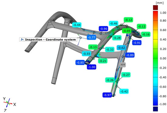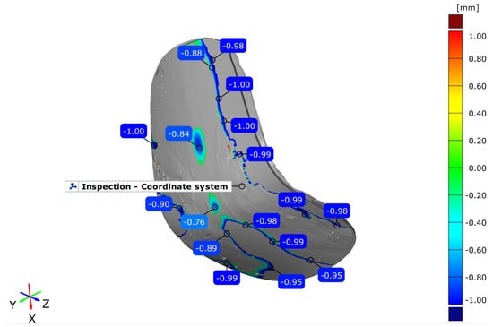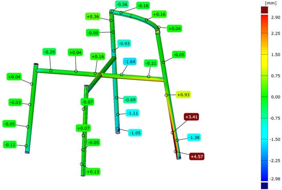 The analysis of dimensional accuracy for this case study is shown in Figure 17. It can be noticed that all deviations of the created CAD model compared to the 3D scanned point cloud are around 1 mm, except for the left rear leg. This deviation results from errors during the 3D scanning process, and the scanner does not detect the surface of the real part due to errors during the 3D scanning. There was a hole in the point cloud in this area. The software automatically filled this hole. This was not a problem for future processing of the part because, for 3D modeling purposes, the right rear leg was used and then mirrored to the left side. It can be seen that this part is symmetric from the left to the right.