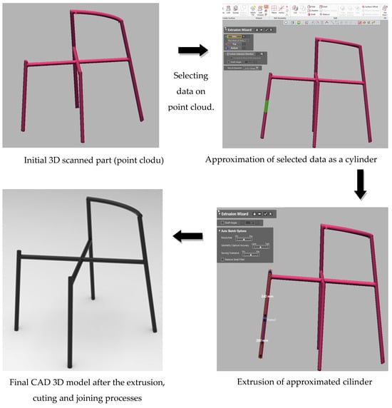 Reverse engineering of this part was performed using Geomagic DesignX software. The whole part is manufactured from the same diameter pipes, enabling an easy reverse engineering process. The extrusion wizard command was used. This command allows the user to select some part of the data from the scanned STL model, and the command automatically recognizes the shape of the selected data and approximates its dimensions. In this case, the command recognizes that a cylinder is the best approximation for these data. In the second step, this cylinder was extruded to the end of the pipes. This process was repeated for all parts. In the third step, the created extrusions of all pipes are cut and joined to form one part. This entire process is shown in Figure 16. After creating an ideal CAD 3D model, this product is reproduced using traditional pipe cutting and welding processes at the Standard Furniture Factory (Ilija, Bosnia and Herzegovina).
