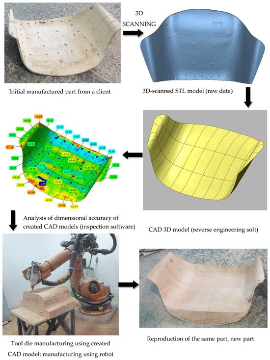 The phases of the third case study are presented in Figure 18. In this case, it was also necessary to reproduce the already manufactured part sent by the client without any technical documentation. The first step was to 3D scan to create 3D CAD models. The CAD models were then used for tool die manufacturing using the robot hand. After that, a manufactured tool die was used to reproduce the same part on a large scale. The entire reverse engineering is presented in Figure 18. This project was carried out in cooperation with the Wood Team d.o.o (Ilija, Bosnia and Herzegovina). As in case study No. 2, the scanning time, scanning processing, and 3D modeling (reverse engineering) took around 1 h each.