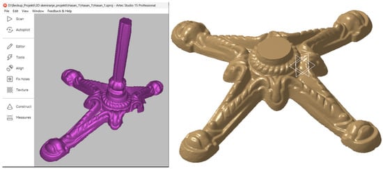 The fourth example shows the necessity of developing and designing a new table support part using an old design in the Austro-Hungarian style (Figure 19). The old defective part was 3D scanned; scanned data were then used to produce a new part. This example has more complex shapes and surfaces, so scanning and scan processing take around 2 h. In this case, 3D modeling was not performed because this product will be reproduced by using sand casting. If the sand-casting manufacturing method is used, the surface quality of the 3D model does not need to be in the form of an ideal CAD model; the STL file can be used. Furthermore, superior surface quality is not necessary for this type of furniture. This 3D model can be used as an STL file. A missing leg can be easily added inside Artec Studio software using the scanned leg as a reference. Additionally, only one leg can be 3D printed and used for sand casting tool manufacturing. It is better to print only one leg due to the material serving for 3D printing. This case study is an excellent example of how additive manufacturing (3D printing) and reverse engineering (based on 3D scanning) can significantly influence and modernize old manufacturing processes like sand casting.