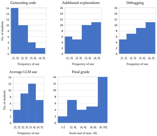 Further on, an overview of the descriptive statistics of the measured variables used in the analysis is provided. Table 1 and the histograms in Figure 2 below offer a comprehensive overview of the extent to which the LLMs were utilized for various aspects of studying and the final grades given.