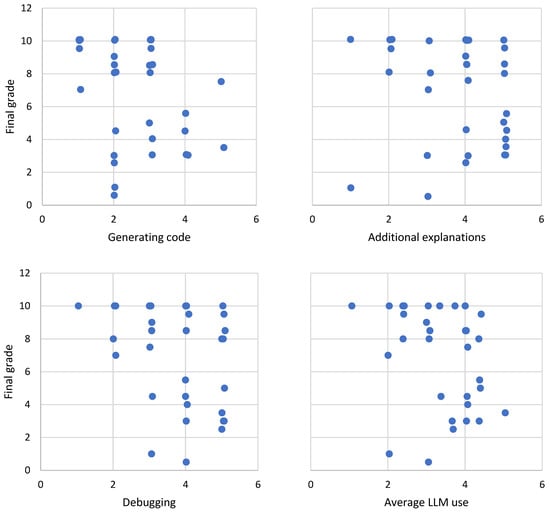 The scatterplots provided in Figure 3 visualize the relationship between the final grades and their reported usage of the LLMs for different study activities.