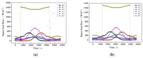 The space heating flow of Jilin−1 GF02 satellite. (a) Incident heat flow on summer solstice; (b) Incident heat flow on winter solstice.
