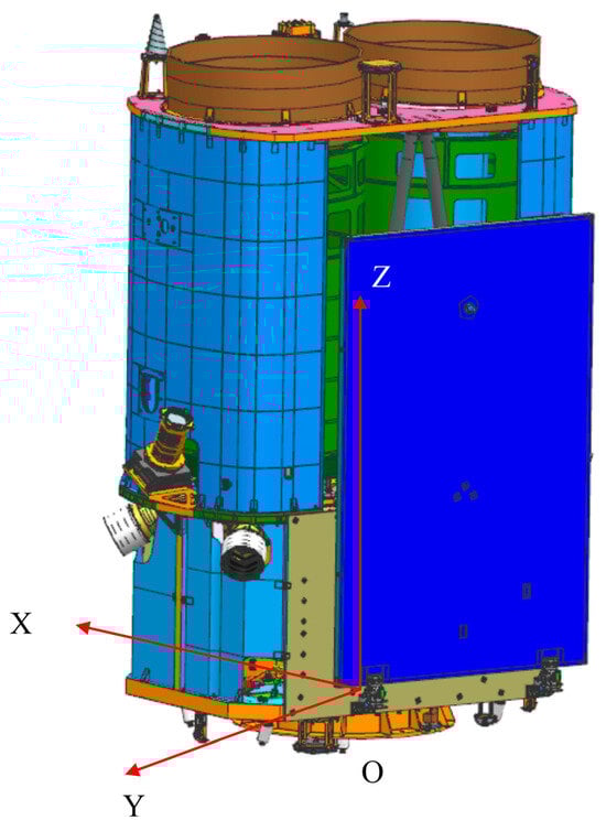 To address the contradictions between low costs, short testing time, and high reliability in the process of satellite development, Jilin−1 satellite development team proposed the heat sink equivalent test method. According to the analysis in Section 2, the remote sensing optical satellite with the orbit of SSO is suitable for the thermal balance test using the heat sink equivalent method. If the vacuum container is large enough and the surface emissivity of the heat sink is high enough, the test error of the equivalent heat sink method is within the acceptable limits. The orbit of the GF02F optical remote sensing satellite is designed to be a 535 km SSO orbit. The local time of the descending node is 11:00, and the mass of the entire satellite is less than 230 kg. GF02F is equipped with two coaxial cameras with an aperture of Φ430 mm. The resolution is 0.75 m, and the fixed coordinates of the satellite are shown in Figure 4 and described below: