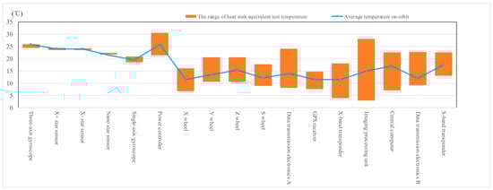 In order to compare the temperature of the GF02F in testing and on orbit more clearly, the highest and lowest temperatures of the GF02F satellite in the heat sink equivalent test and the average temperature on orbit are presented separately in Figure 6.