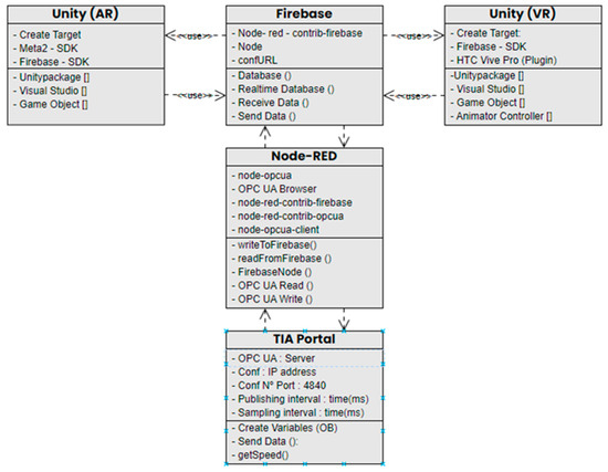 To implement the communication of the proposed architecture, the platforms shown in the class diagram in Figure 2 will be used, where the process data are sent through the OPC UA and Node-RED protocol to the cloud and then these data will be displayed on the PC screen and will also be used to create monitoring and control applications in virtual and augmented reality environments. The packages and libraries used for the bidirectional communication in each of the stages are also detailed; in later sections, each of these stages are explained in more detail.
