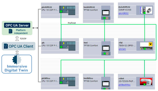 The programming and configuration of the stations were performed using TIA Portal software where it should be considered that there is a large data volume in the stations; therefore, within the programming, the main blocks to be used are: organization blocks (OB), which is used to control the flow of the program because they allow for processing cyclically and also allow for data communication between different levels defining the behavior of the system; in the proposed DT architecture, they are used for the start, end, and synchronization events of the models. Function blocks (FB) are a reusable block that allows the storage of data permanently to perform a specific task; these data are available at any time or stage in the proposed architecture and are used to represent different components (sensors, actuators, etc.) of the DT, giving greater flexibility when simulating the behavior of that component. Data blocks (DB) store important data for the operation of the process, in the presented framework they are used to store the real-time information of the DT components. In addition, these blocks are used to send the information to the Node network for further processing and visualization. Function blocks (FC) are used to perform complex calculations and additional operations required by the DT to make decisions based on data and process states. The network topology was configured using TIA Portal where the stations communicate through the profinet protocol and then, these data are sent through the OPC UA and Node network to interact with the DT. Figure 3 shows the topology of the devices and networks used in the proposed architecture.