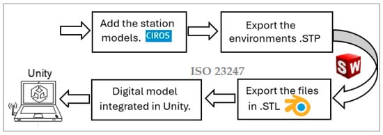 The creation of the digital environment was based on the ISO 23247-3 standard and was performed in the Blender and Solid Works environment, which is a type of software used for modeling and creating 3D content, in addition to having the option of rendering, modeling, and animation, making it perfect for interaction with AR and VR, allowing for the creation of 3D models to map the physical and kinematic properties of the elements and devices of the plant, and subsequently, with the Unity engine, they are exported to create animations in real-time. They also have high performance and enough libraries and communication protocols to interact with different devices and subsequently define the coupling of movement depending on the processes. The simulation module was developed as a virtual model, which is a representation of the production lines and physical resources, which are connected and synchronized with the physical entity in real time through data received from wireless sensors and simulation data. Figure 4 shows the sequence to carry out the digital design of the stations, which is carried out through the following process: (1) add the required station models to Ciros Studio V 6.2, (2) export the environments with the extension STP to Solid Works, (3) export the files in STL format files to Blender where the editing for the simulation is performed and the elements are increased according to each station to achieve a more faithful finish of the physical design, and (4) the digital model file is integrated into Unity, with the programming that will allow for the establishment of bidirectional communication and synchronization between the physical twin and the DT.