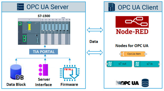 It should be considered that the DB blocks are used to store the information of the DT components, so all of the variables to be used in the DT should be created and one should make sure to activate the accessibility to them to guarantee the communication between the different environments. In addition, when selecting the server interface, the variables to be transferred to the client must be selected and an ID node will be observed for each enabled variable; these variables will be used for communication from Node-RED. Figure 5 shows the OPC UA communication diagram used in the proposed DT architecture.