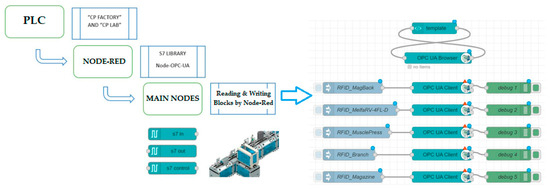 The programming and configuration of the PLC were carried out using TIA Portal software where the programming of the entire process is carried out for each of the stations. The PLC used is the S7-1500 where the input and output modules used in the process are configured. Through Node-Red, one can interact with the information from the PLC and in this way obtain real-time data from the DT with bidirectional communication for monitoring and configuring the process. For communication between the PLC and Node-Red, the TCP/IP, MQTT, OPC UA, etc., protocols can be used. The proposed architecture is shown in Figure 5 where OPC UA is used and the PLC is configured to act as an OPC UA server, and the nodes and TAGs that will be sent to Node-Red are also defined. In Node-Red, the nodes are installed for communication with the OPC UA protocol. In our case, “node-opcua” and “OPC UA Browser” were used. Subsequently, the connection is established by configuring the IP, cycle time, specific port, slot, and rack; these parameters are established to have an ordered identification of the variables received in node-red. The PLC TAGs must be translated into the format required by the new instances, and specific URL addresses can be used for each interaction. Subsequently, each OPC UA node belongs to a class called NodeClass where the common attributes of the OPC UA nodes are defined as shown in Figure 6.