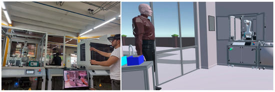 To validate the AR and VR environments with the DT, an interaction is carried out with the elements of the manufacturing cell for the supervision, simulation, and control of certain process parameters. The system was implemented on the Unity platform where it works with the real-time data that arrive from the process; Meta 2 glasses for AR and HTC VIVE glasses for VR are used, which allow for interaction and visualization with the physical environment in real time. The AR application allows additional information to be observed so that the operator can interact with the virtual environment and allows for control of certain parameters from the glasses, enhancing the experience. In the application with VR, the operator can control and monitor the physical machine remotely through a virtual reality helmet, which provides greater mobility at work and, at the same time, maintains an immersive experience as seen in Figure 9.