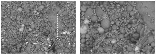 Figure 7 shows an SCM of the 20% fly ash replacement after 60 days of hydration. The images show the formation of portlandite and ettringite, as highlighted by their expected crystal formation.
