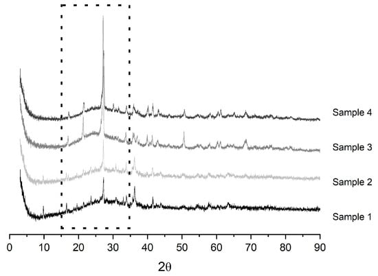 The XRD patterns of four samples taken from Phase 1 in the ash field are shown in Figure 8. The amount of reactive silica and alumina in the ash is largely responsible for its reactivity, which has been noted by Alelweet et al. [], who also studied the ash in Moneypoint. Previous work on fly ash mineralogy has identified up to 316 individual minerals and 188 mineral groups [,], with the most abundant phase being glass, with crystalline compounds such as quartz, mullite, magnetite, melilite, gehlenite, kalsilite, calcium sulphate and alkali sulphate accounting for 5–50% [].