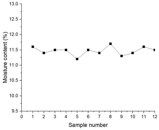 The moisture content from the twelve flay ash samples taken is shown in Figure 9. As shown, the moisture contents ranges from 11.25% to 11.75%, with the average around 11.5%. This moisture content was considered during the concrete production, to ensure 0.5 w/c was achieved throughout, to ensure the design strengths were reached. The relatively high moisture content would indicate that the ash should be dried before use, or the free water content should be adjusted to account for the moisture within it.