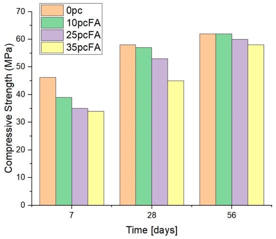 The concrete compressive strength results are shown in Figure 10. As may be seen, the compressive strength results are not significantly affected with the addition of FA, compared with the CEM I only/0% FA samples at each age. However, the 35% FA samples do take longer to achieve similar strengths to CEM I only and to the other fly ash replacement levels. At 56 days, though, all compressive strengths appear to be similar.