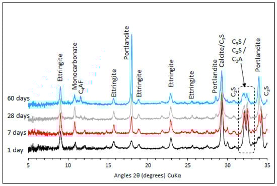 The main hydrates, including portlandite and ettringite, along with calcite, are observed as expected. Due to the presence of approximately 4.8 g/100 g of calcite in the clinker (see Table 3), permitted for CEM I cements under EN 197 [], monocarbonate is the most abundant AFm phase [,], as shown by the peak at 10.8 2 which remains as hydration continues over time. Ettringite is the dominant AFt phase and is stable over time, with dominant peaks at 9, 15.8, 19 and 23 2.