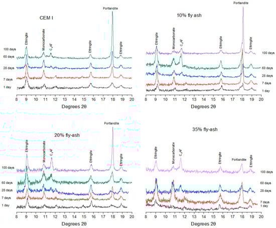 De Weerdt et al. [] suggested that the main differences between plain and blended cements containing SCMs are best observed at low angles (8–13° ), where the main peaks of the AFm and AFt phases are found. Figure 12 shows the XRD patterns at these low angles for the three cement replacements here after 1, 7, 28, 60 and 100 days of hydration. Monosulphate, which has been shown to diffract at 9.8 in the literature [], is not shown in the patterns, whereas monocarbonate is precipitated at 11.5, with a stable ettringite phase at 9.7 over time. Some hemicarbonate is shown at 11 at 7 days but decreases over time as monocarbonate is formed. These observations are consistent with previous studies [,,]. Unfortunately, XRD patterns at 60 days for the 35% replacement samples are not available.