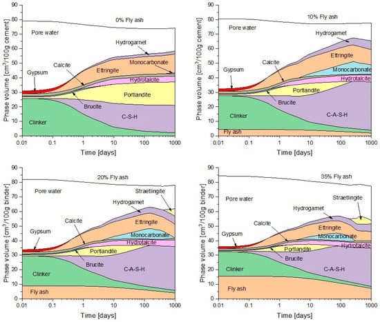 In terms of hydrates volume, replacement levels above 20% show a slight reduction. This has been observed in the literature [,,], which found reductions in compressive and flexural strength in concrete samples when the fly ash replacement exceeded 20%. Small amounts of hemicarbonate are predicted in the 20% and 35% samples, which correspond with the slow reduction in monocarbonate. Previous works in the literature [,] also show small amounts of hemicarbonate, and Lothenbach et al. [] postulated that the intermediate formation of hemicarbonate is due to the relatively slow dissolution of limestone and insufficient dissolved carbonate being available. While there is no clear XRD evidence for hemicarbonate in Figure 11, the amounts predicted in the model are very small. Not predicted in the thermodynamic predictions over time or the experimental data, at least within the timeframe here, is the existence of strätlingite. As may be seen in Figure 14, it is predicted to form after completing full hydration for all levels of fly ash replacement, due to the amount of soluble silicate in the ash.
