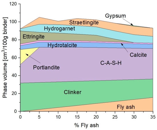 Phase assemblage for fully hydrated binder with fly ash replacements ranging from 0 to 35%.