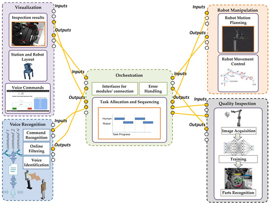 In the proposed configuration of the framework, four modules are integrated with the core module of the framework “Orchestration” for the HRC quality inspection of products, namely: