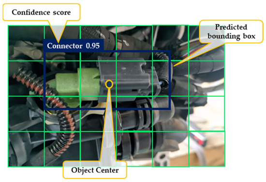 Considering all the aforementioned information, the final prediction vector of each grid cell is of shape and if that is expressed relative to the grid-separated image, it is transformed into the matrix , as it depicted in Figure 2. It is worth mentioning here that the grid is not applied to the original image but rather to the feature map of the final layer of a convolutional neural network referred to as backbone. The aforementioned procedure is visualized in relation to the corresponding image part in Figure 2.