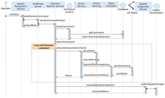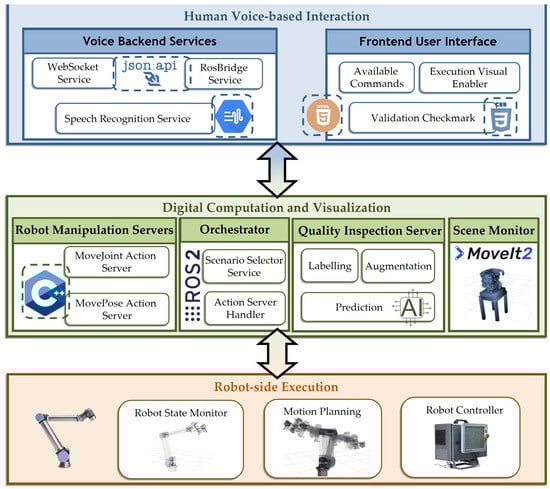 The proposed solution introduces a modular voice-enabled ROS2 framework for quality inspection, designed to operate in industrial environments. The central point of this approach is to provide human operators with control over the inspection process, minimize downtime and promote efficiency compared to existing methods. By prioritizing modularity, the framework achieves seamless integration with existing systems and provides the flexibility to introduce different technologies related to human–robot interaction and inspection. Furthermore, compared to past solutions, the deployed ROS2-based architecture enables scalability and reliability since the system’s execution and coordination will not be halted in case a node is shut down.