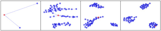 The dynamic topology learning of Growing Neural Gas (GNG) algorithm. The blue bullets are neurons of GNG. The red bullet represents newly inserted neuron as the topology grows.