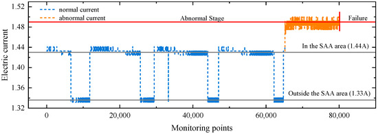 Payload Dataset: This dataset consists of operation data collected from the Payload of China’s aerospace satellite. It includes variables such as current, voltage, temperature, and command parameters, totaling 66 dimensions. To represent a typical anomaly of a complex mode type during its operational phase, a subset of 96,662 samples was extracted following preprocessing steps, including noise reduction. Upon analyzing the data samples, a change in current was observed during abnormal operational stages, although it remained within the valid threshold values. Figure 2 shows that under normal conditions, the payload operates with a current of approximately 1.44 A within the South Atlantic Anomaly (SAA) and around 1.33 A outside the SAA. However, an anomaly occurred with a current surge to approximately 1.49 A. To reduce the influence of significant variations in current dimensionality during experimentation, we reduced the dataset to retain the remaining 65 dimensions and then selected 80,000 normal samples as the training set and the remaining 16,662 samples as the test set. The test set comprised 3083 anomalous samples and 13,580 normal samples.