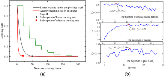 As shown in Table 1, to learn the inputting pattern, the winner and its neighbors will change their weights by multiplying fixed rates and . Previous works [26,27] indicate that using a dynamic learning rate is helpful for modeling streaming data. In this paper, the adaptive learning rate is designed, and the calculation equation can be calculated as follows.
