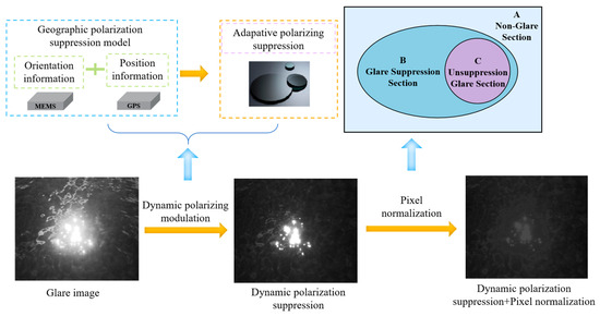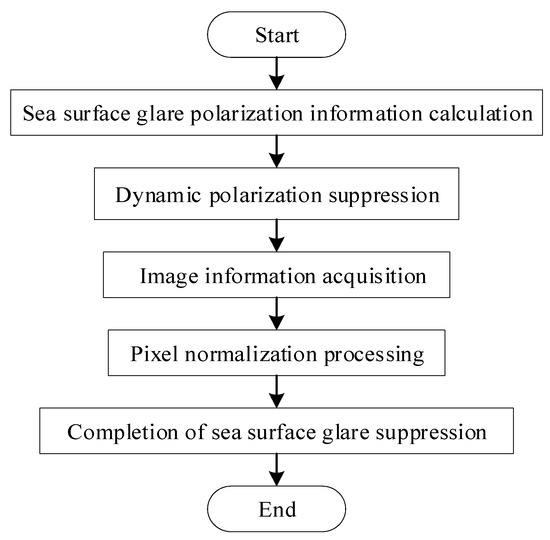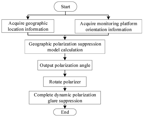 The method described in this paper is based on the polarization characteristics of sea surface glare and the temporal variation of these polarization properties, facilitating adaptive polarization suppression of the glare. By constructing a geographic polarization suppression model and combining it with a pixel normalization technique, we achieve real-time, stable adaptive polarization suppression of sea surface glare throughout the day. The general methodological flowchart for sea surface glare suppression is shown in Figure 1.