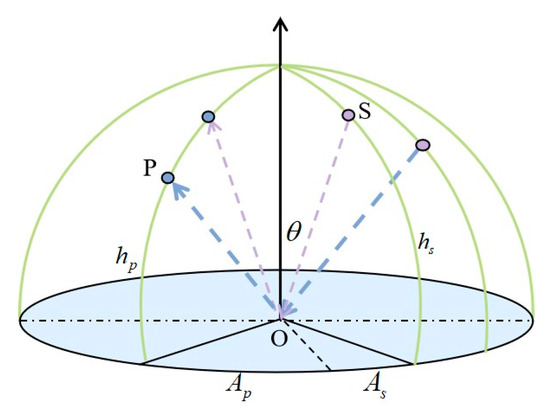 Therefore, the expression for the solar and lunar altitude angles is shown in Equation (11), and the light incidence angle is shown in Equation (12).