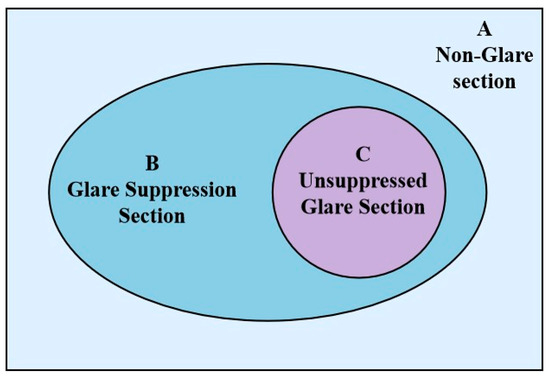 This proposed method, guided by the principle of radiometric normalization, establishes a further suppression technique for images following dynamic polarization adaptive suppression. The pixel normalization method establishes a transformation relationship between the pixel values after dynamic polarization suppression and the glare pixel values, mapping the post-suppression pixel values to glare pixels to effectively restore glare pixels. As shown in Figure 5, the composition of the image after dynamic polarization suppression includes three parts: part A represents the non-glare portion; part B represents the dynamic polarization suppression portion; and part C represents the unsuppressed glare portion. In the proposed pixel normalization glare suppression method, part B is taken as the reference pixels, and then pixel normalization processing is applied to part C.