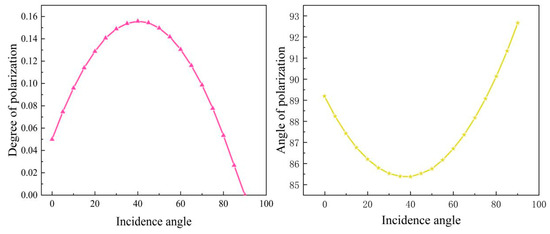 Relationship curves between different incidence angles and both glare polarization degree and glare polarization angle.