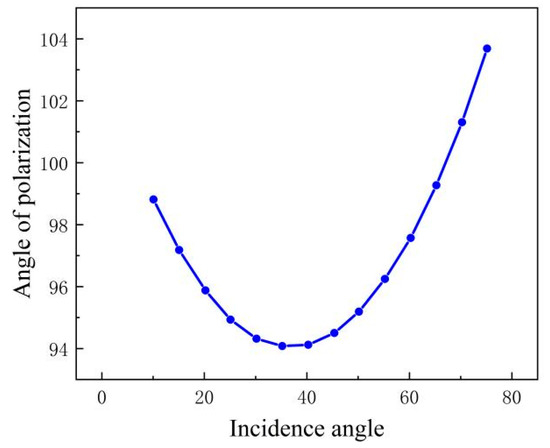 In this study, the original experimental data were subjected to smoothing and fitting processing. As can be observed from Figure 8, there is a distinct incident–polarization relationship between the light incidence angle and the glare’s polarization angle in the fitted polarization angle curve. This relationship is of significant importance for the glare suppression method.