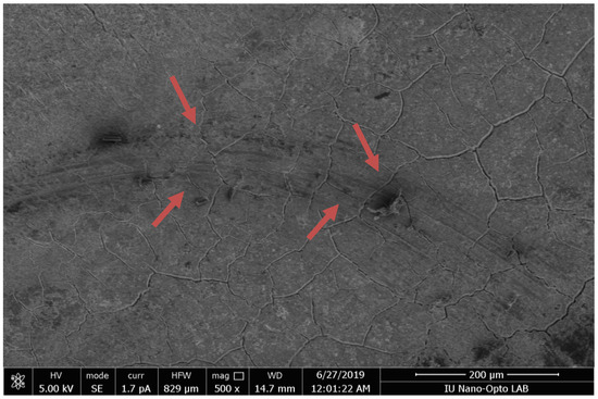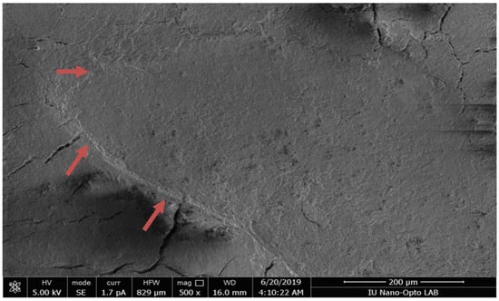 Several scratch marks (train track) from the curette blades on the root surface (pointer) in the group 3 sample with a root roughness index of 1. Scanning electron microscope photograph, ×500.