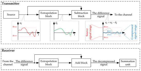 Theconcept of differential coordinated group transformation (illustration for a single channel of a multichannel system). Red—source signal, green—the extrapolated one, blue—the compressed (difference) signal.