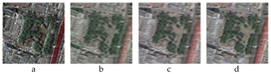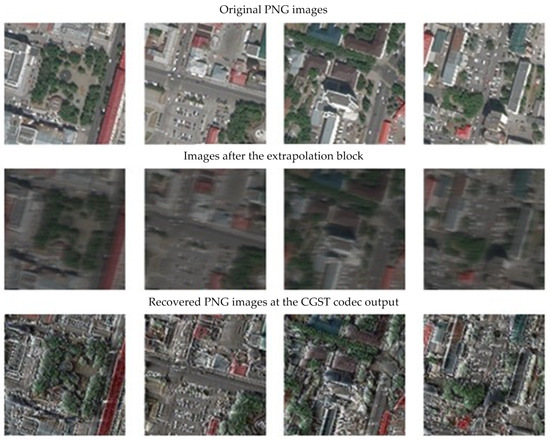 The field of effective image compression is a current area of research, especially in satellite remote sensing systems [48]. These systems face the challenge of providing energy efficiency. Therefore, we tested the effectiveness of the CGST performance on images from the satellite remote sensing system. For this, we obtained data using the free navigation program SASGIS. This program enables the download of satellite images of the Earth’s surface from various online mapping services. We chose Yandex Maps, which acquires images from Ikonos, QuickBird, and WorldView2 satellites. We compiled a dataset of 200 PNG images each with a resolution of 128 × 128 pixels that covered Ufa city (Russia, Republic of Bashkortostan) [49].