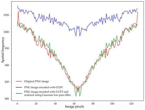 Spatial frequencies of the original (red), compressed by modified CGST (blue), and restored images with a Gaussian low-pass filter technique (green).